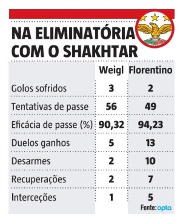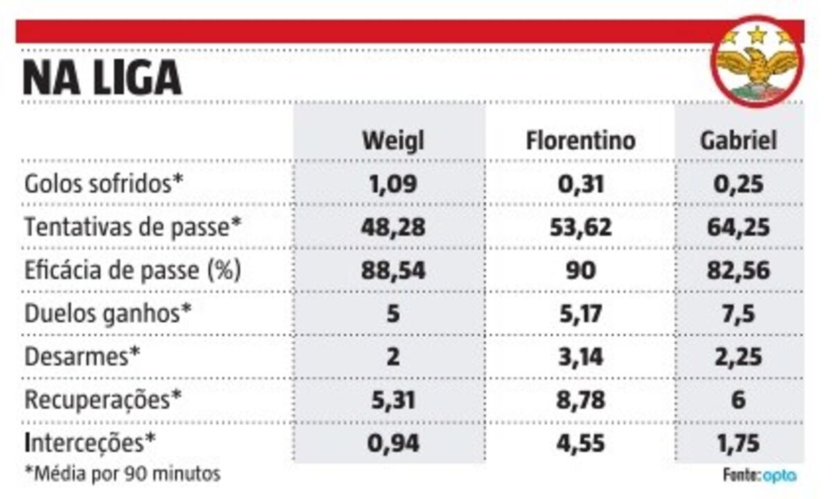 Florentino deixou de figurar no onze encarnado, logo em novembro, mas fazendo o balanço de três jogadores que já atuaram na posição 6, o jovem é aquele que, à luz das estatísticas, dá mais segurança. Comparado com Gabriel, que atuou ali quatro vezes no campeonato, e Julian Weigl, contratado em janeiro, Florentino, de 20 anos, superioriza-se nos capítulos de passes, interceções, recuperações e desarmes, apenas perdendo para Gabriel nos duelos.Se olharmos isoladamente para as partidas com o Shakhtar Donetsk, relativas aos 16 avos-de-final da Liga Europa, o português, que jogou na Ucrânia, bate o internacional alemão, titular na Luz, de forma clara. Apesar da derrota, por 2-1, em Kharkiv, Florentino esteve em grande plano ao nível das interceções, recuperações e desarmes. Já no Estádio da Luz, ainda que o Benfica tenha empatado, os números de Weigl ficaram muito aquém dos do internacional sub-21 português.