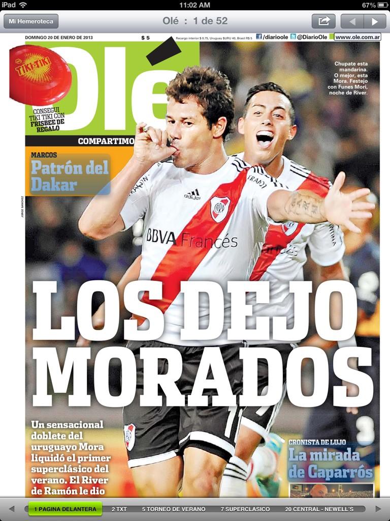 Olé: Rodrigo Mora bisa no 'superclássico' e é o destaque