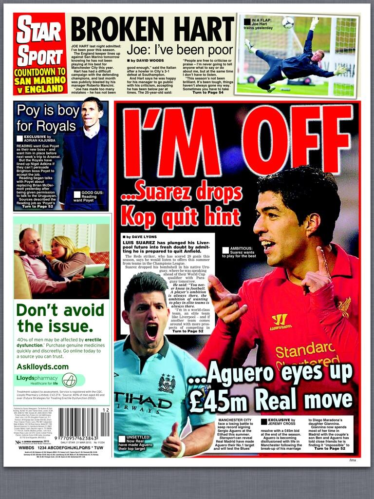 Star Sport: Suarez - I'm off (Suarez); Broken Hart; Aguero eyes up £45m Real move