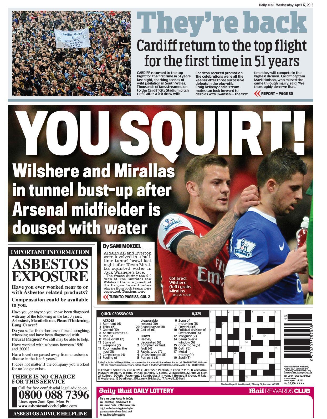 Daily Mail: "You squirt! Wilshere and Mirallas in tunnel bust-up after Arsenal midfielder is doused with water"