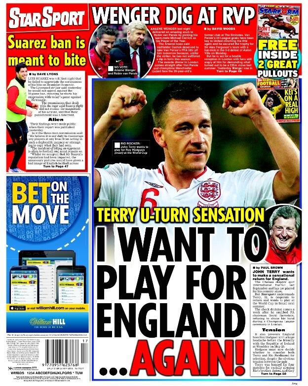 Daily Star - Terry u-turn sensation. I want to play for England...again!