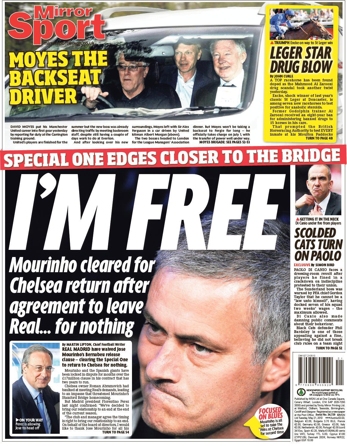 Daily Mirror - "I'm free. Mourinho cleared for Chelsea return after agreement to leave Real...for nothing"