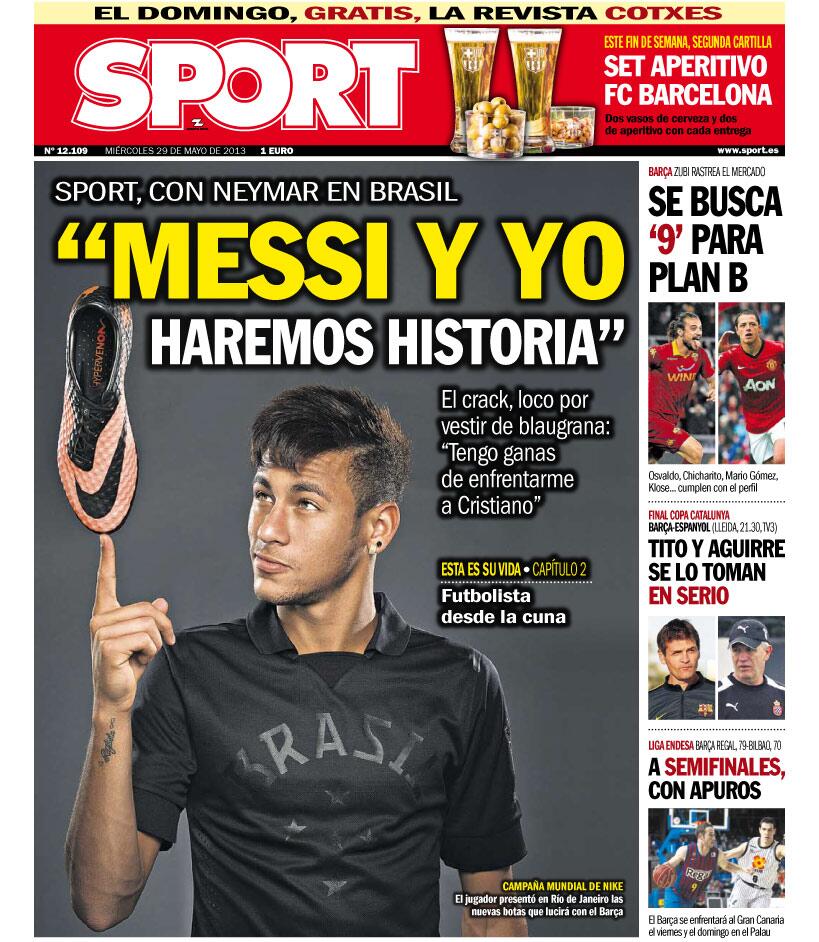 SPORT: "Messi e eu faremos história" - Neymar. Barça procura um '9' (Osvaldo, Chicharito, Goméz e Klose são opções)