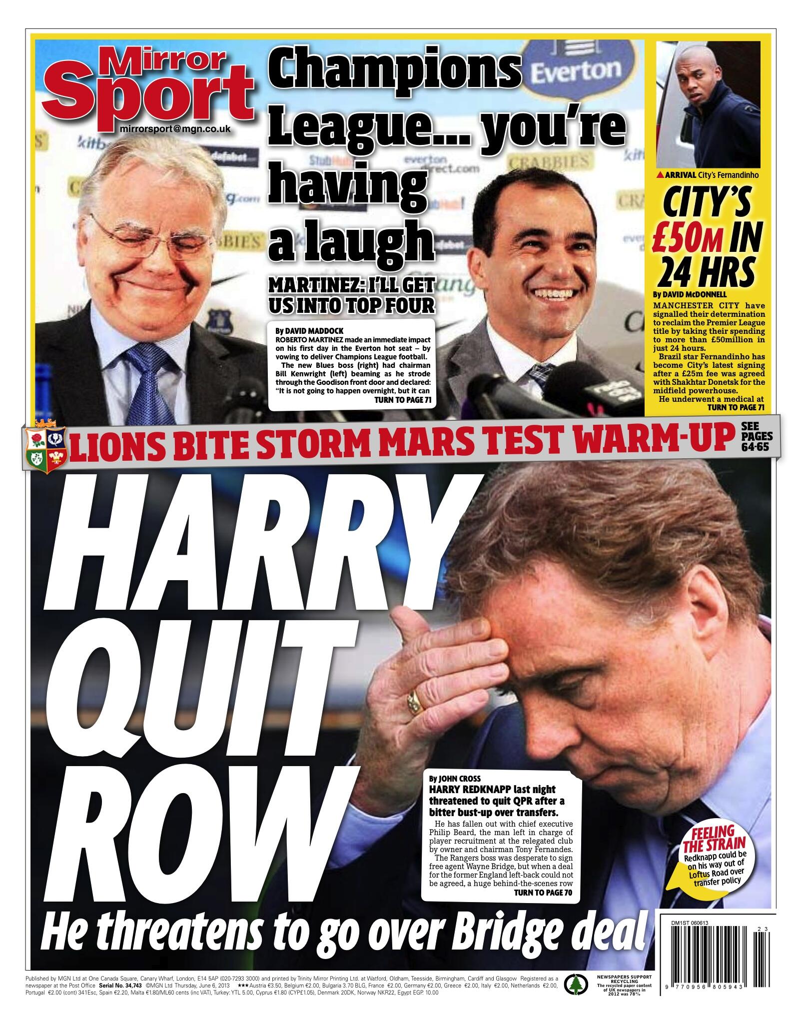 Daily Mirror - "Harry quit row. He threatens to go over Bridge deal"