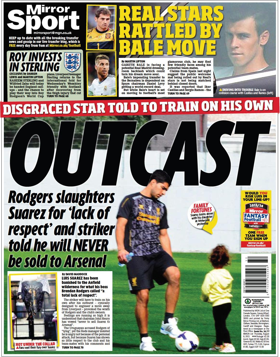 Daily Mirror "Outcast -Rodgers slaughters Suarez for 'lack of respect' and striker told he will NEVER be sold to Arsenal"