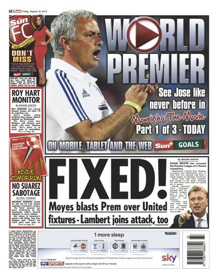 Sun back page - "Fixed! Moyes blasts Prem over United fixtures - Lambert joins attack, too"