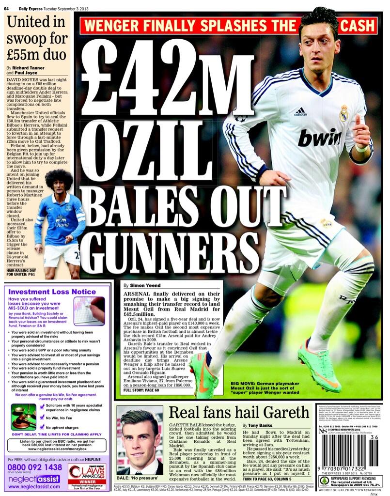 Daily Express - "£42m Ozil bales out Gunners"