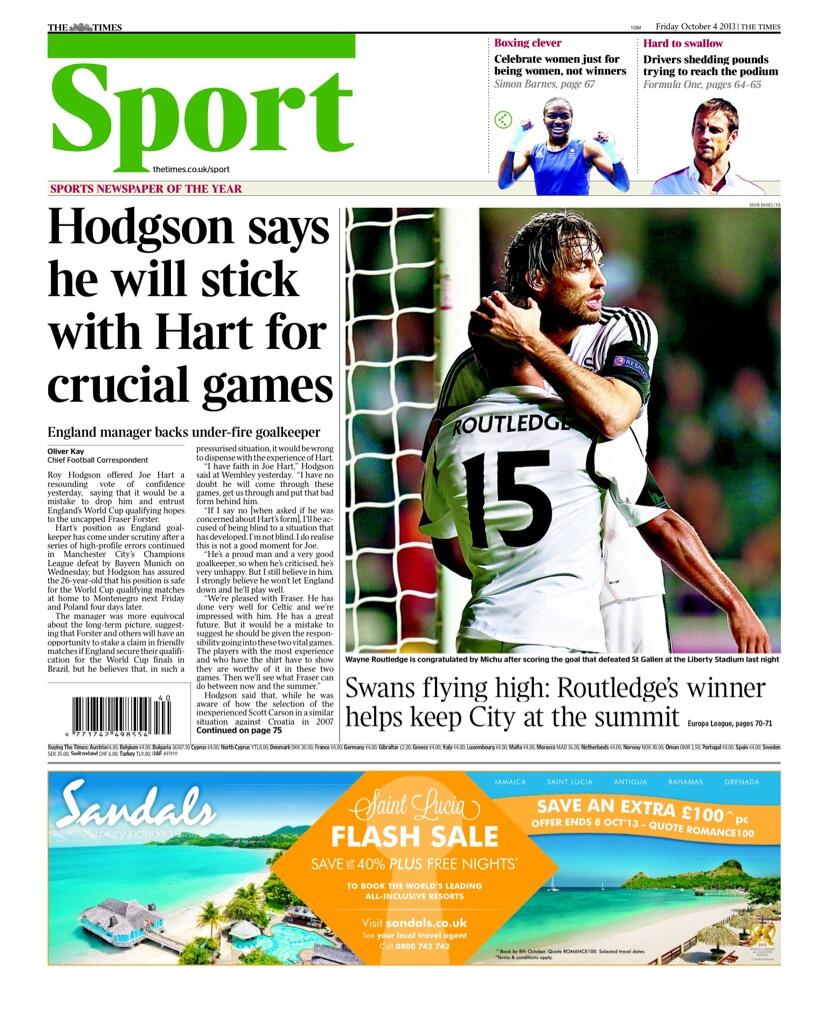 TIMES SPORT: Hodgson says he will stick with Hart