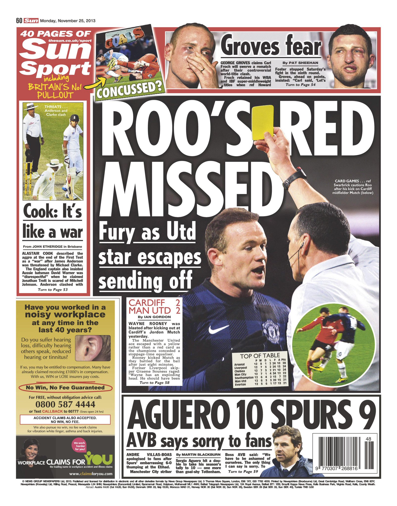 Sun - "Roo's Red Missed". "Aguero 10 Spurs 9"