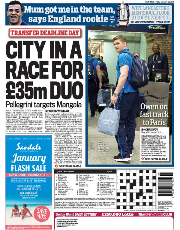 Daily Mail - "City in a race for £35m duo (Mangala e Fernando)"