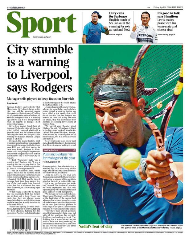 Times - "City stumble is a warning to Liverpool, says Rodgers"