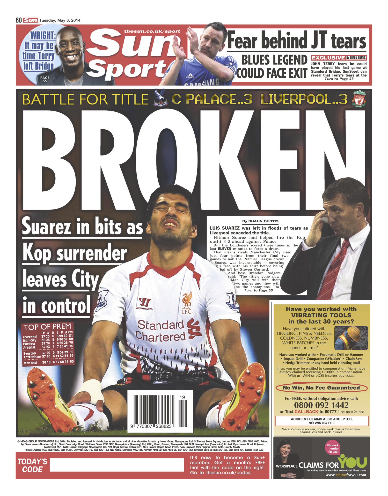 Sun - "BROKEN - Suarez in bits as Kop surrender leaves City in control"