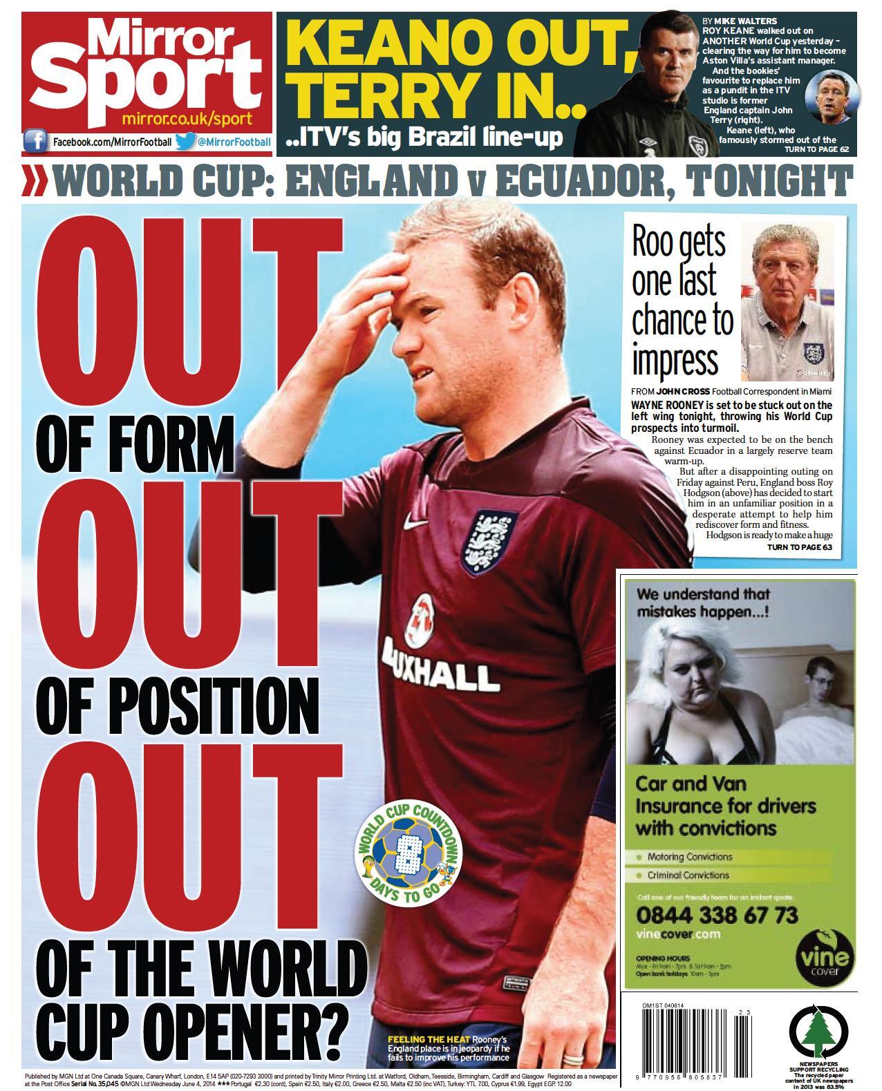 Daily Mirror - "OUT of form OUT of position OUT of the World Cup opener"