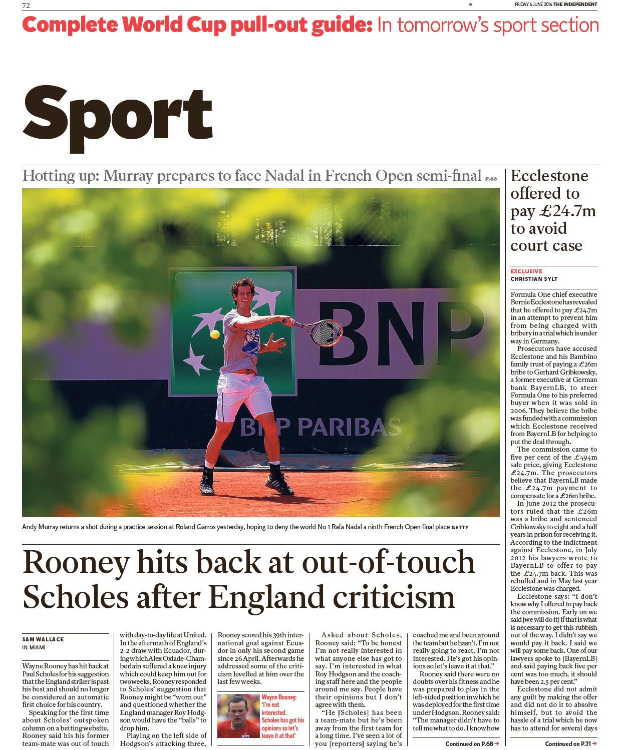 Independent - "Rooney hits back at out-of-touch Scholes after England criticism"