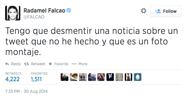 Imagem: Falcao desmente ter escrito sobre a transferência para o Real Madrid