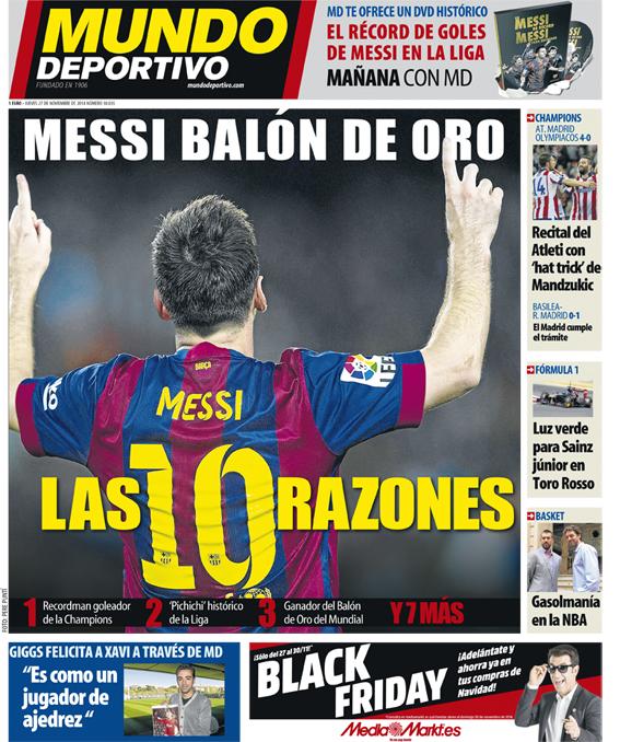 As duas últimas exibições de Lionel Messi, com dois hat-tricks e dois grandes recordes atingidos, fizeram a imprensa catalã despertar novamente para o avançado argentino. Empolgado, o "Mundo Deportivo" lançou esta quinta-feira uma campanha a favor de que o argentino seja eleito o melhor jogador do mundo mais uma vez, listando 10 motivos para isso:27 novembro 2014