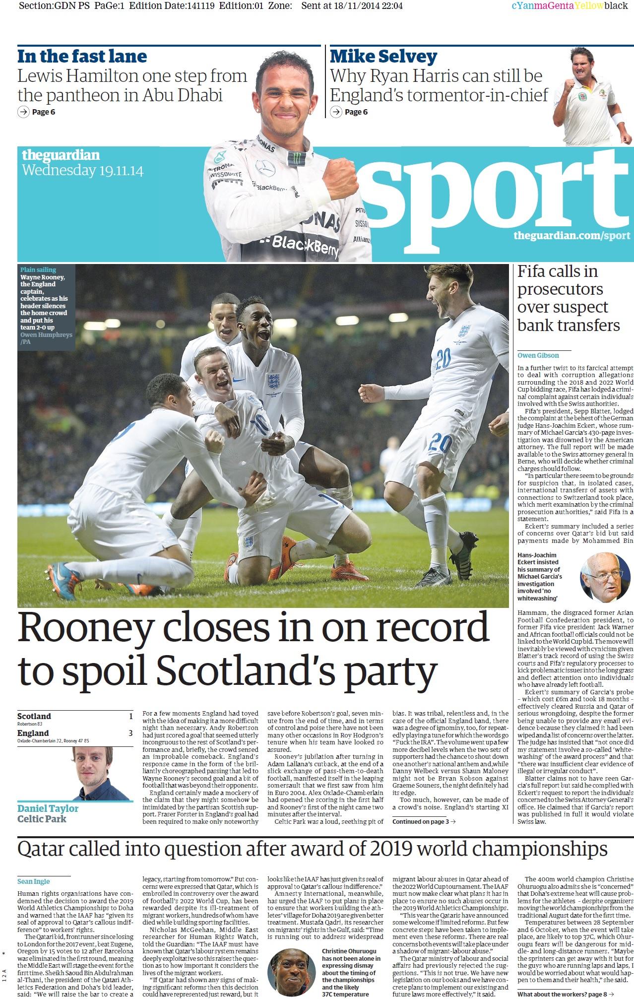 Guardian Sport: "Rooney closes in on record to spoil Scotland’s party"
