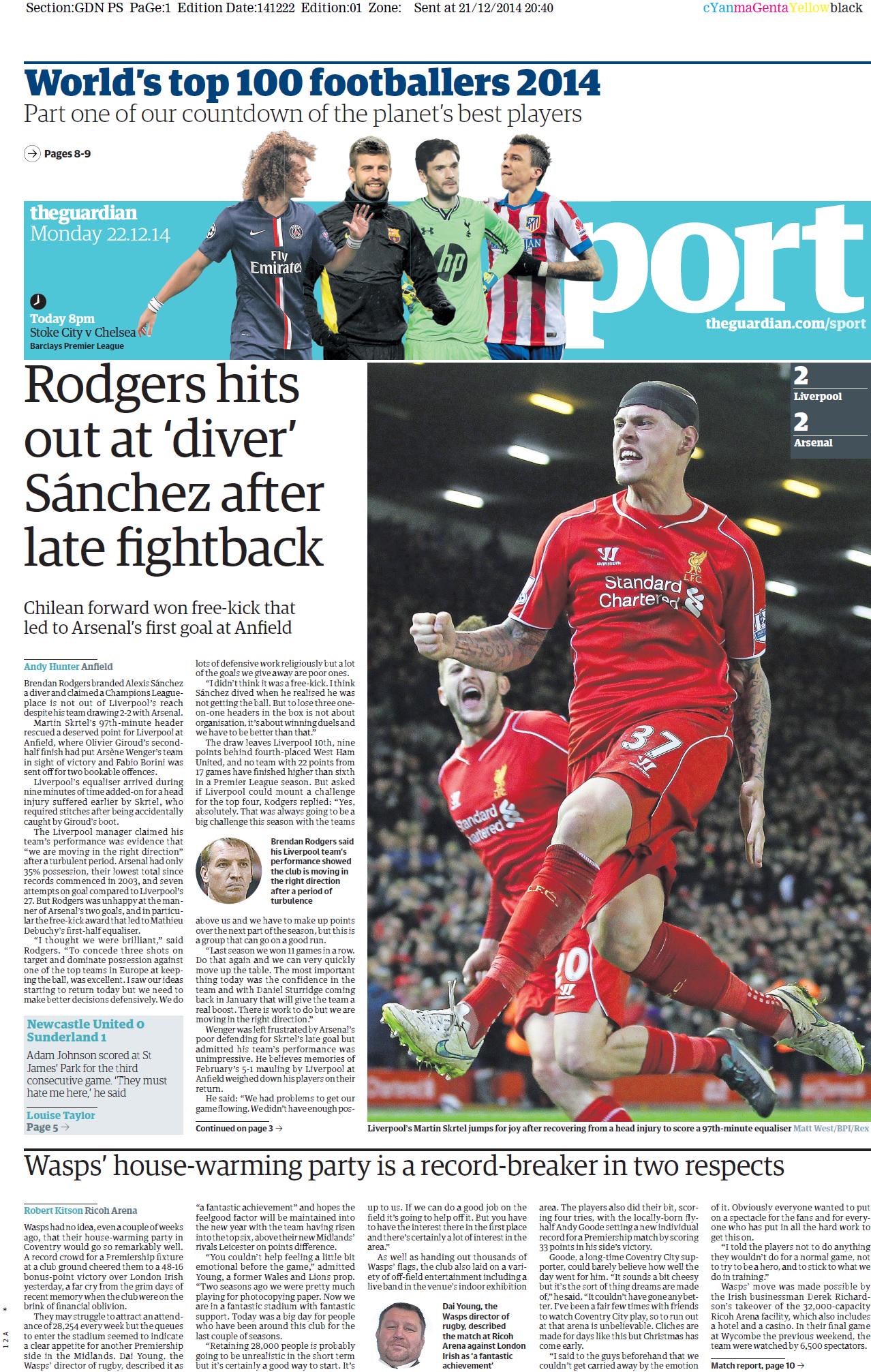 Guardian Sport: Rodgers hits out at ‘diver’ Sánchez after late fightback