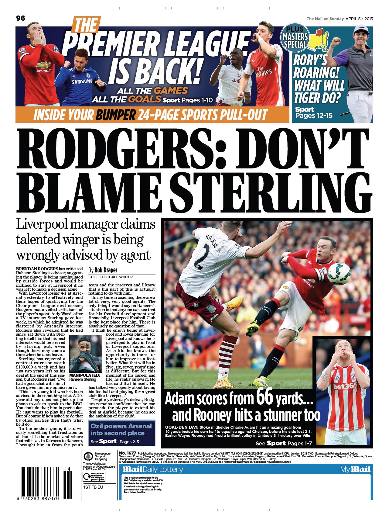 Mail on Sunday: Rodgers: Don't blame Sterling