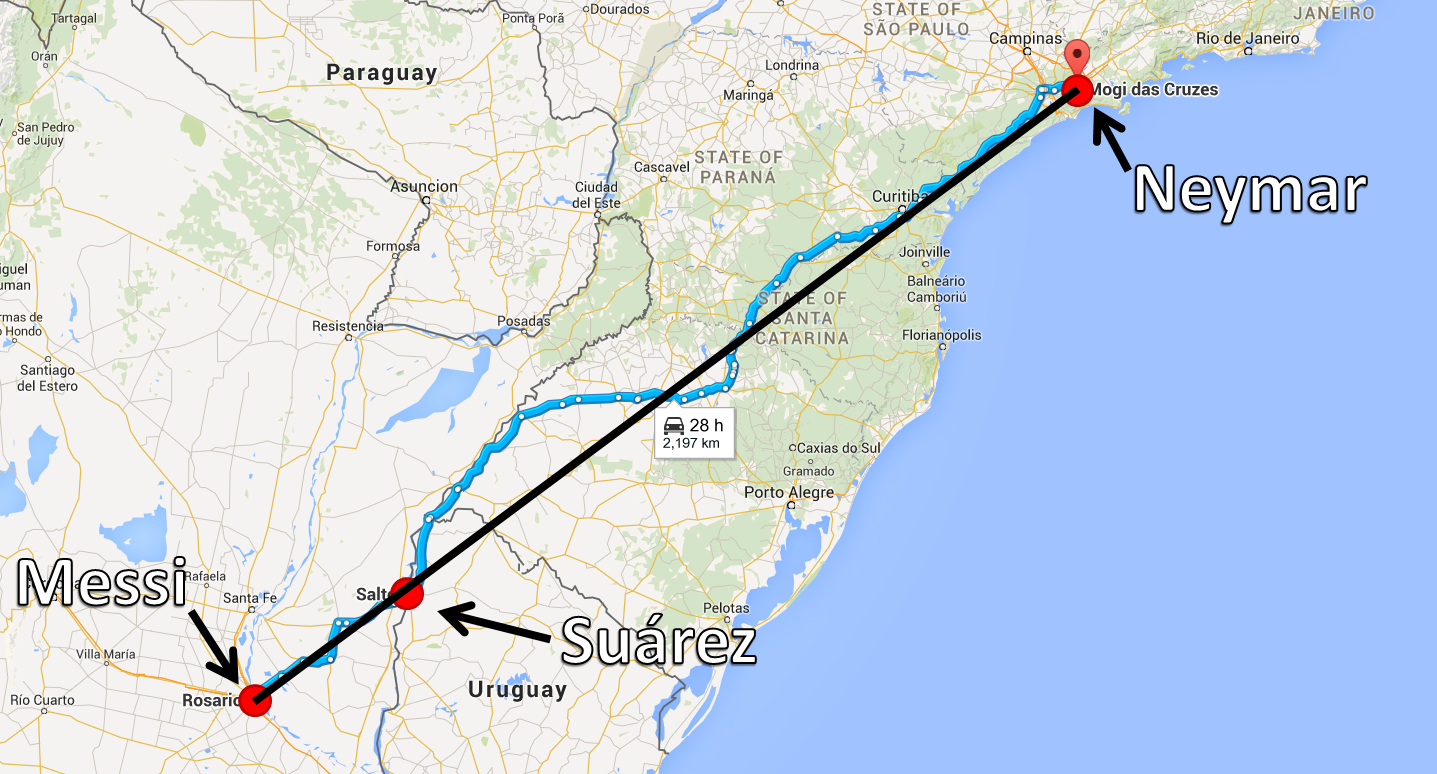INCRÍVEL!!! Locais de nascimento do trio do Barcelona MSN forma uma linha reta perfeita (Imagem)