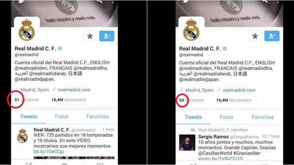 Poucas horas após o anuncio do adeus de Casillas ao Real Madrid os merengues deixaram de segui-lo na conta oficial de Twitter