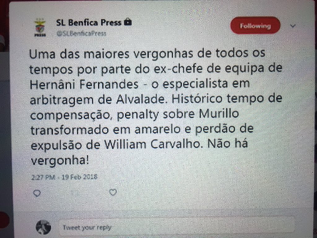 O Benfica através da conta de Twitter destinada à Comunicação Social reagiu ao encontro do Tondela - Sporting. As águias falam numa "das maiores vergonhas de todos os tempos".