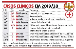 O Benfica regista nove casos clínicos desde o arranque dos trabalhos, a 1 de julho, sendo que oito deles foram por problemas físicos como o último registado, o de Chiquinho, no clássico diante do FC Porto (o outro foi a gastroenterite de Ebuehi). Neste registo não estão contemplados os casos de André Almeida (lesionou-se em 2018/19) e Gedson (fraturou o quinto metatarso direito nas férias).
