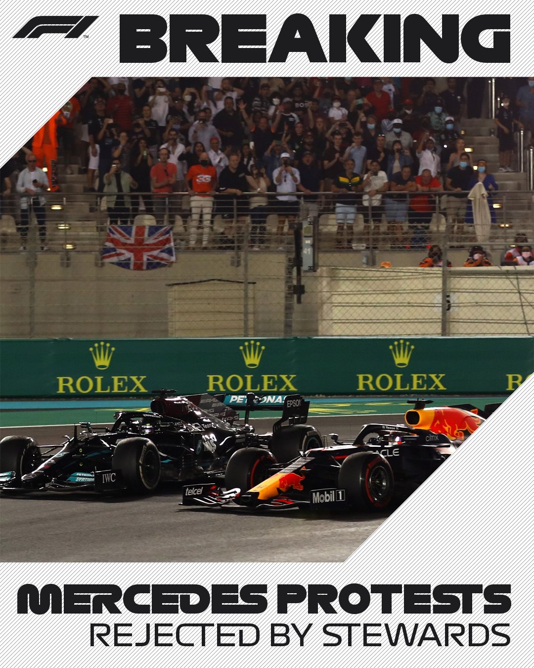 Negado o primeiro protesto da Mercedes, que apontava ao artigo 48.8 dos regulamentos, seguiu-se a análise ao procedimento que a Direção de Corrida teve neste domingo, depois de numa primeira instância ter proibido ultrapassagens durante o Safety Car e, após um pedido de esclarecimento de Chris Horner, chefe da Red Bull, a Michael Masi, ter dado o aval para o holandês ultrapassar os carros que prosseguiam à sua frente. Lembre-se que estes carros que seguiam à frente de Verstappen já tinham sido dobrados pelo holandês, pelo que não interferiam na luta pelo triunfo em Abu Dhabi.