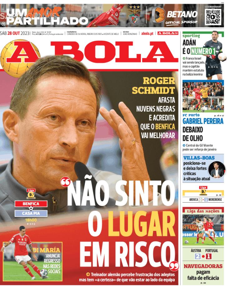 Capas: As justificações de Schmidt, o jogo do Benfica e ainda as novidades em Alvalade e a milésima vitória de Pinto da Costa à vista