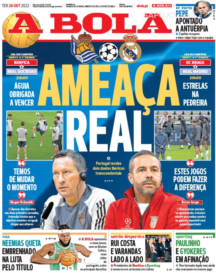 Capas: A 'final' do Benfica na Champions e o Braga-Real Madrid, as novidades em Alvalade e as dúvidas no FC Porto para a deslocação à Bélgica