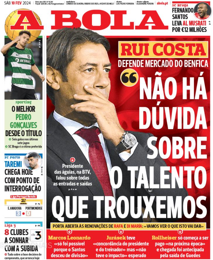 Capas: Rui Costa e o mercado, a entrevista a Proença, as contas no Dragão e os destaques em Alvalade